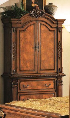 Montecito TV Armoire by Coaster Furniture. This armoire is rendered in a medium chestnut finish with warm ash veneers and birch solids. It features hand carved accents and burl inlays on the doors and drawer fronts. Indulge yourself and your family with the luxury and style of the Montegue Bedroom Collection.